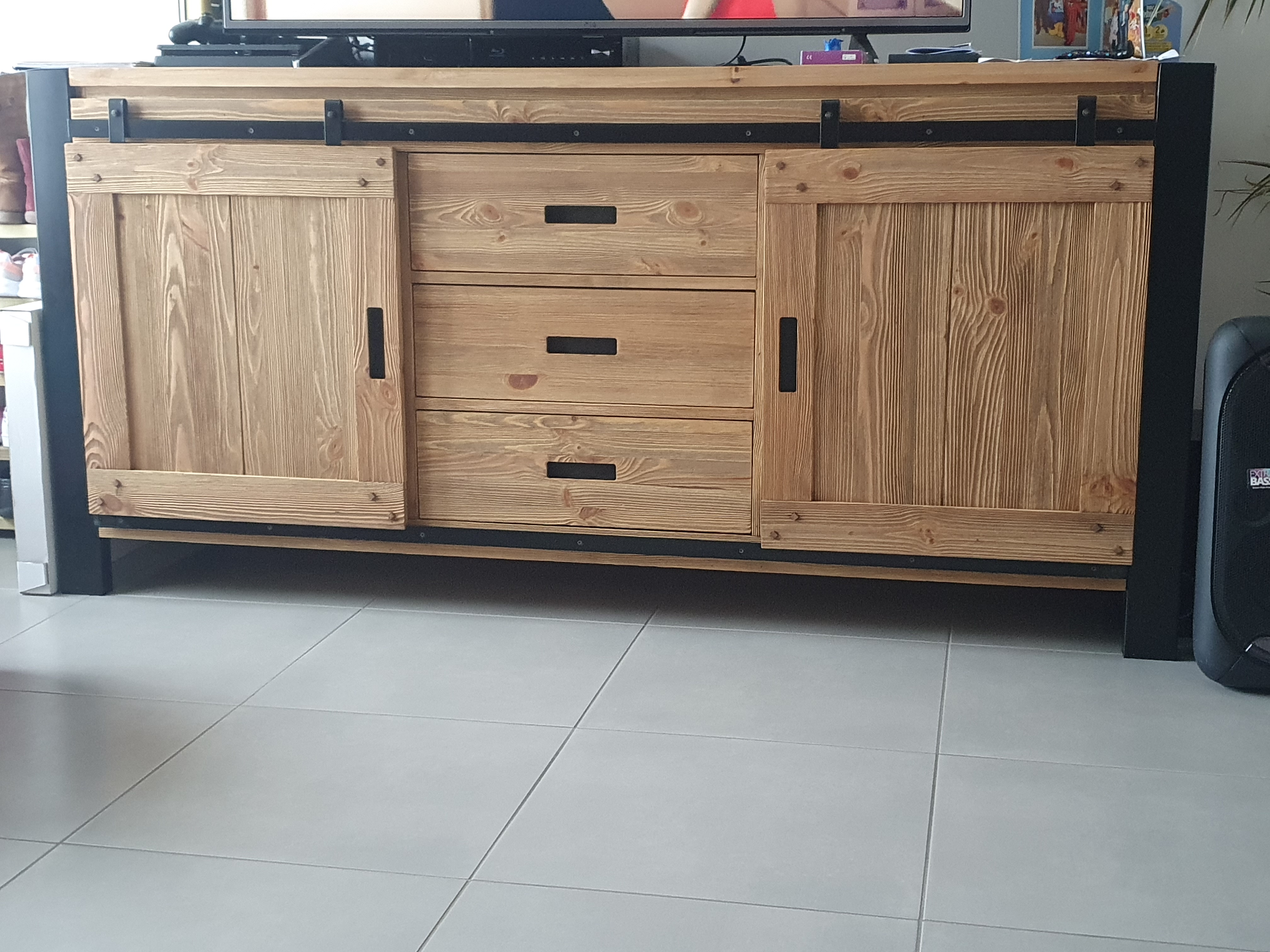 Très beau meubles TV , en métal noir et bois, un peu plus foncé que sur le site , il rend très bien chez moi, j'adore ! livraison dans les temps , je suis très satisfaite😊